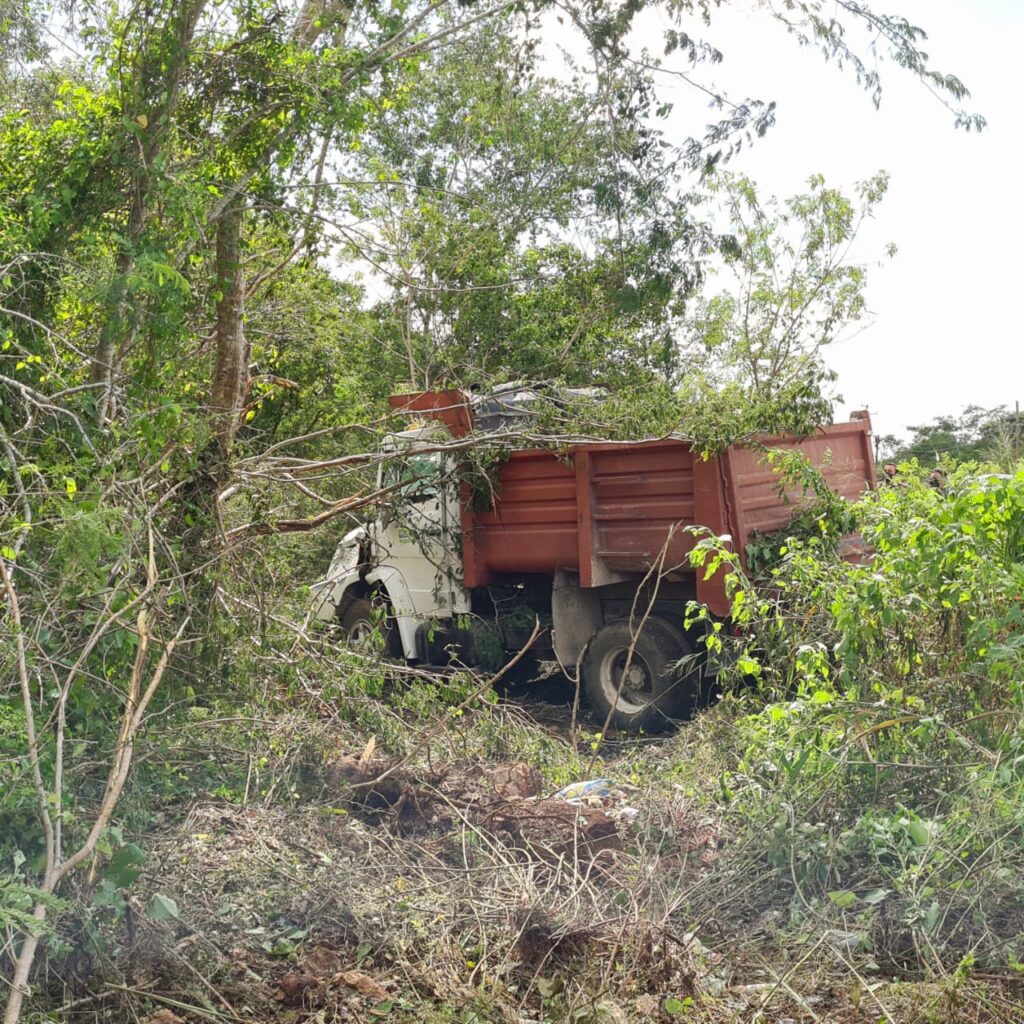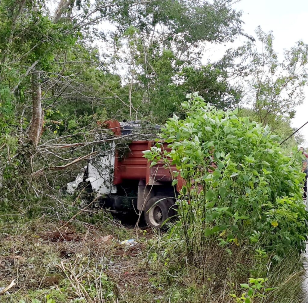 El operador del volquete de la empresa Baga, con placas YS2650B, se enfilaba rumbo a Texán, cuando ya había avanzado cerca de un kilómetro del distribuidor vial de la Mérida-Tetiz, pero se orilló apenas de la cinta asfáltica para provocar que pierda el control del volante, y emerger por el carril opuesto hasta recorrer varios metros dentro el monte.
