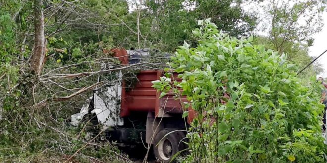 La pesada unidad de materiales para construcción quedó con una parte frontal averiado, tras estrellarse contra un árbol de dzalam, que incluso derribo. Hasta eso el volquetero resultó ileso, y no le quedó de otra que llamar a su patrón y al ajustador.