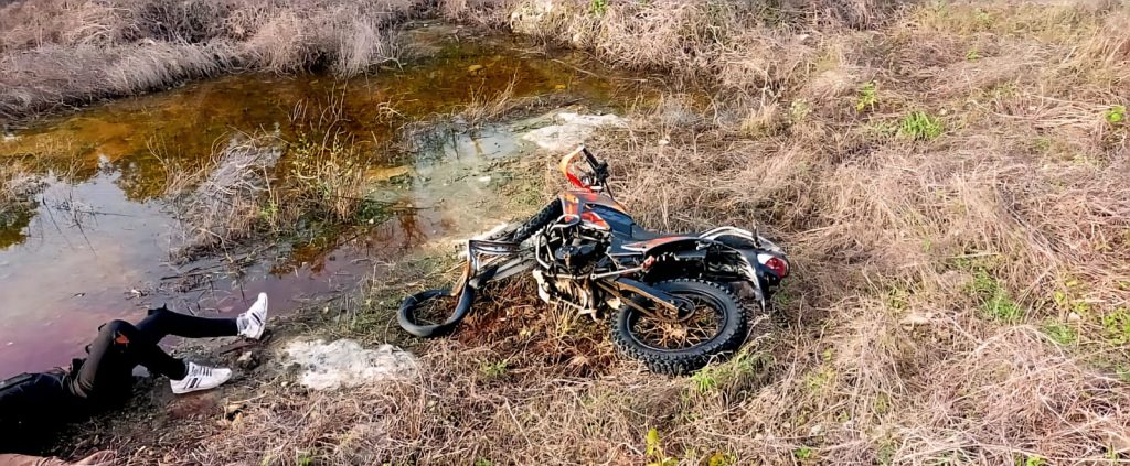 Por desgracia, al salirse del pavimento, la motocicleta avanzó entre piedras y tierra por varios metros hasta terminar destrozada entre la yerba, con los jóvenes a un lado.