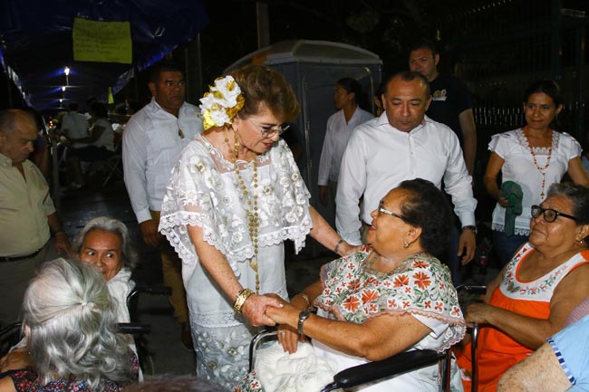 La alcaldesa María Fritz Sierra asistió al festejo luciendo un terno blanco con flores del mismo color combinadas con dorado. Su esposo, Jorge Estrada Avilés, hijos y nietos también eligieron prendas regionales como blusas bordadas, sombreros de huano y guayaberas.