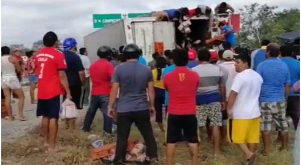 Pobladores cometen rapiña de pan tras volcadura de tráiler, en Calkiní