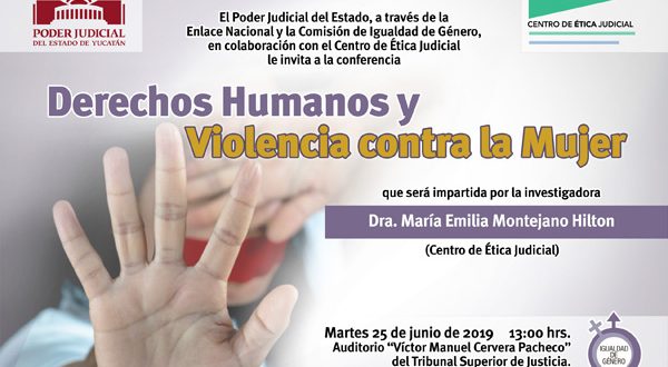 El Poder Judicial del Estado de Yucatán invita a todo el público a la conferencia “Derechos Humanos y Violencia contra la mujer” a cargo de la Dra María Emiliana Montejano Hilton que se realizará el próximo martes 25 de junio a las 13:00 horas en el auditorio “Víctor Manuel Cervera Pacheco” del Tribunal Superior de Justicia.