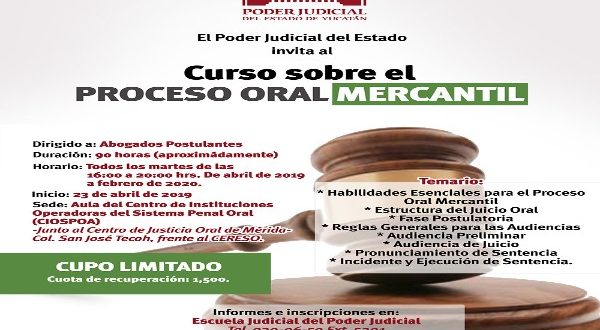 El Poder Judicial del Estado de Yucatán invita a los abogados postulantes al curso sobre el proceso oral mercantil que iniciará el próximo 23 de abril en el aula del Centro de Instituciones Operadoras del Sistema Penal Oral (CIOSPOA).