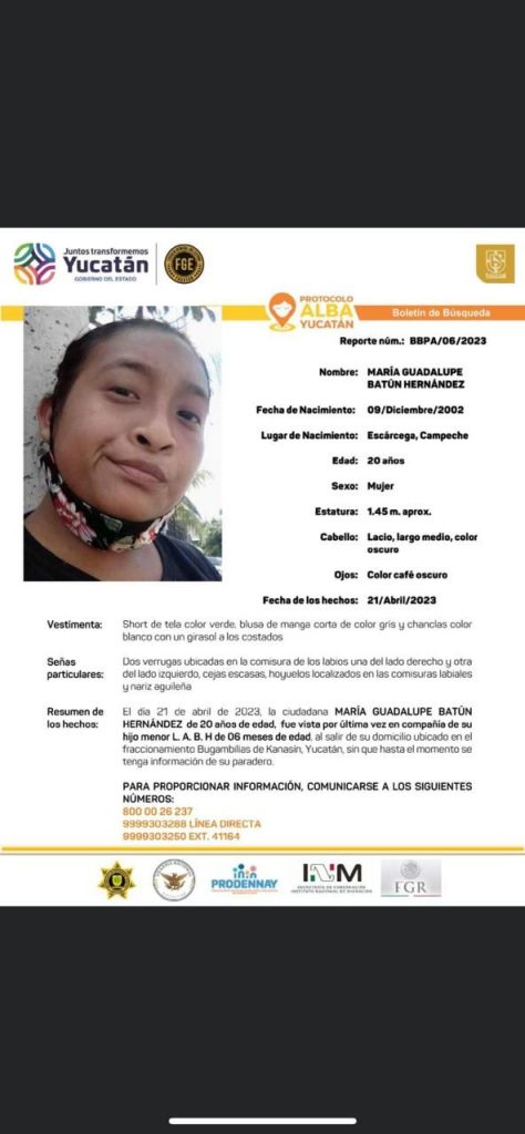 KANASÍN, Yuc., 28 de abril 2023.- Elementos de la Policía Municipal de Kanasín lograron ubicar a María Guadalupe B.H., de 22 años de edad, y a su hijo de apenas 6 meses de nacido, y que no está registrado, quienes habían sido reportados como extraviados a través del protocolo Alba Yucatán con número BBPA706/2023.
