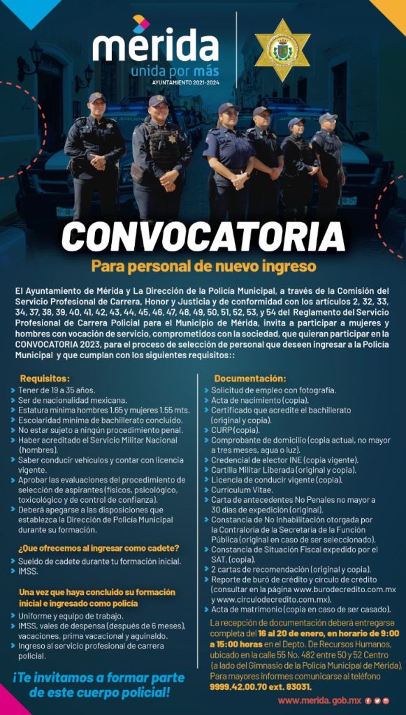 Mérida, Yucatán a 16 de enero de 2023.- La Policía Municipal de Mérida convoca a todos los ciudadanos y ciudadanas interesados en servir a la sociedad realizando labores de seguridad, tránsito y prevención, a participar en el proceso de reclutamiento y selección para trabajar como agentes de esta corporación policial.