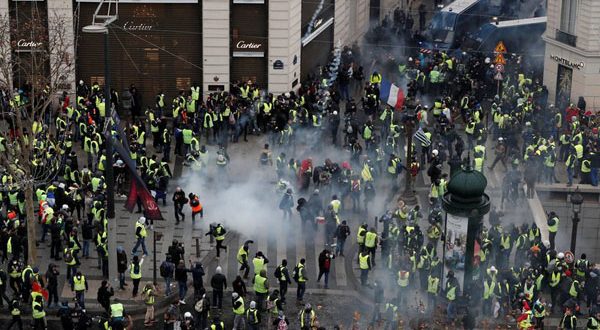 Tear gars floats in the air around protesters wearing yellow vests during clashes with French Gendarmes on the Champs-Elysees Avenue as part of a demonstration by the "yellow vests" movement in Paris, France, December 8, 2018. REUTERS/Benoit Tessier
