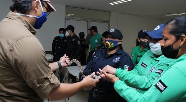 En presencia de la titular de la Secretaría de Desarrollo Sustentable (SDS), Sayda Melina Rodríguez Gómez y del titular de la Policía Ecológica, Obdulio Delaney Mena Sánchez, los 15 elementos pertenecientes a dicha corporación escucharon a los biólogos Toshio Yokayama y Asis Alcocer, sobre la importancia biológica de los animales reptiles, la metodología para atender una mordedura, ya sea seca o con veneno, e incluso interactuaron con dos tipos de serpientes y un cocodrilo de talla pequeña para conocer más sobre las técnicas de captura.