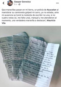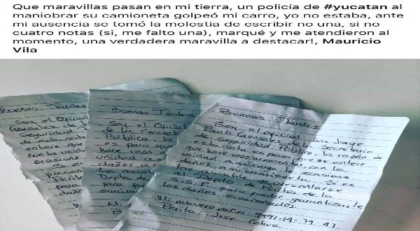 “Qué maravillas pasan en mi tierra, un policía de Yucatán al maniobrar su camioneta golpeó mi carro, yo no estaba, ante mi ausencia se tomó la molestia de escribir no una, si no cuatro notas (si, me falto una), marqué y me atendieron al momento, una verdadera maravilla a destacar”, explicó el afectado.