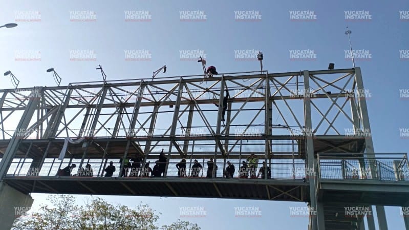 MÉRIDA, Yuc., 12 de febrero 2024.- Elementos de la Secretaría de Seguridad Pública realizon esta mañana un operativo para rescatar a un sujeto que trepó hasta la parte superior de un puente peatonal del periférico, al oriente de la capital yucateca.