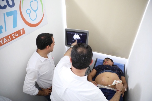 También, Vila Dosal supervisó la operación del consultorio 24/7 instalado en Panabá, el cual es el primero dentro de este esquema que cuenta con equipo para ultrasonido, beneficio que paulatinamente irá llegando a los otros que ya se han puesto en operación en el estado. Ahí, atestiguó el primer estudio de este tipo que se realizó a Jazmín Gómez Acosta, quien está embarazada.