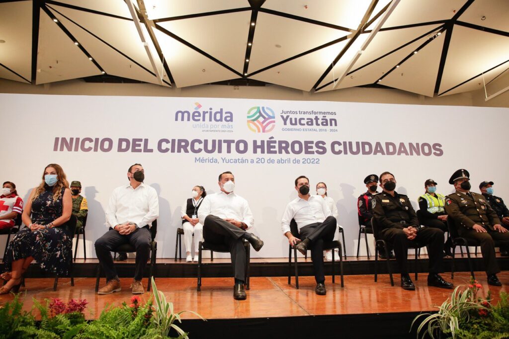 Mérida, Yucatán, 20 de abril de 2022.- El Gobernador Mauricio Vila Dosal y el alcalde de Mérida, Renán Barrera Concha, pusieron en funcionamiento el circuito Héroes Ciudadanos, servicio de transporte gratuito para personal de salud, protección civil, policías y bomberos, así como a personal del Ejército, Marina, Guardia Nacional y la Fiscalía General del Estado que, a través de 19 recorridos, conectará con hospitales, estaciones e instalaciones de guarda parques, paramédicos y de la Guardia Nacional.
