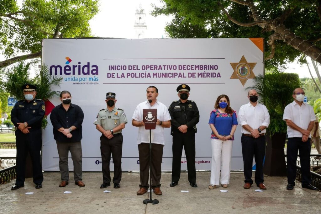 Mérida, Yucatán, 2 de diciembre de 2021.- Ante la reactivación económica y el incremento de la actividad comercial en el Centro Histórico, el Alcalde, Renán Barrera Concha, encabezó esta mañana el arranque del Operativo Decembrino de la Policía Municipal de Mérida para garantizar la seguridad y tranquilidad de las familias.