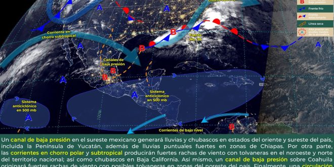 El establecimiento de una vaguada sobre la península de Yucatán aunado al ingreso de aire marítimo tropical, favorecerán incremento de nublados y probabilidad para lluvias aisladas en el centro y sur de Campeche, oriente, centro y noroeste de Yucatán, así como en el estado de Quintana Roo. Además, el ambiente se tornará muy caluroso en el día y cálido al amanecer con viento del este-sureste, cambiando por la tarde al noreste y noroeste con rachas de 40 km/h.