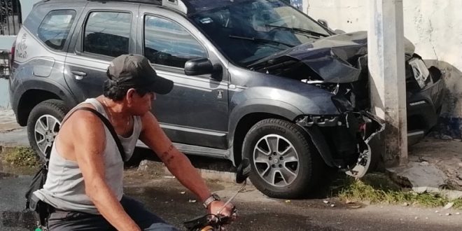 Manejar con exceso de velocidad y leer un mensaje de “WhatsApp” en su teléfono móvil resultó una mala combinación para el conductor de una camioneta Duster la mañana de ayer en calles del centro de Mérida.