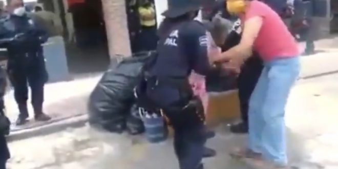 Policías del municipio de Cadereyta, Querétaro forcejean con una ancianita para obligarla a ponerse cubrebocas.