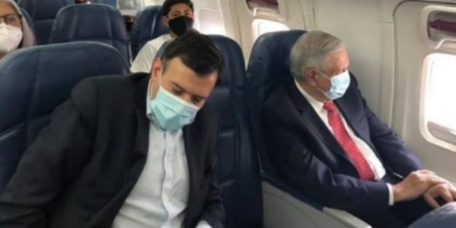 El presidente de México, Andrés Manuel López Obrador, partió este martes en un avión comercial rumbo a Washington para reunirse con su homólogo estadounidense Donald Trump, y por primera vez uso un cubrebocas.