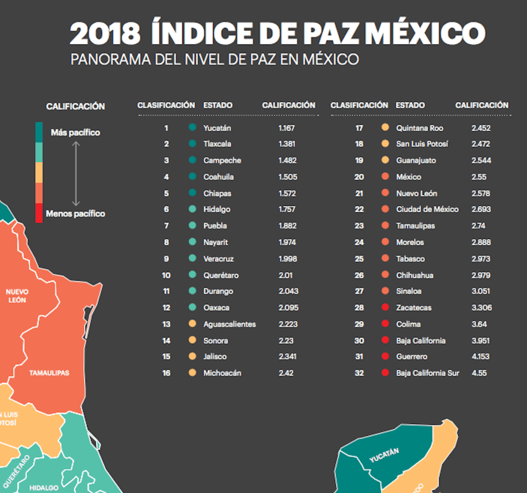 Otros ejercicios de análisis dan cuenta de la situación de seguridad en Yucatán. Por ejemplo, Índice de Paz México (IMP) 2018 del Institute for Economics and Peace (IEP) –que reveló que el 2017 fue el año más violento que se tiene registro en México– lo plantea con claridad: “Yucatán se ubicó como el estado más pacífico de México” con una calificación de 1.167, muy por encima de estados como Guerrero y Baja California Sur con número por arriba de 4.
