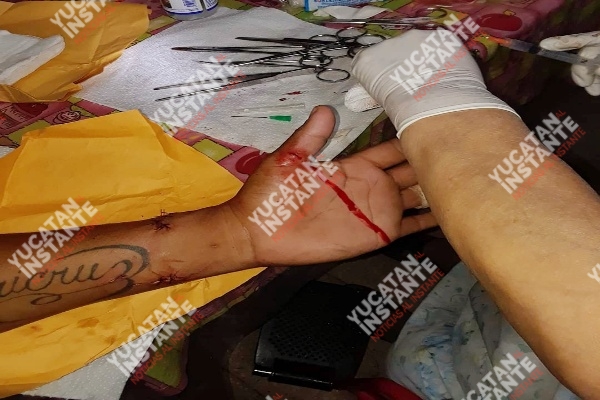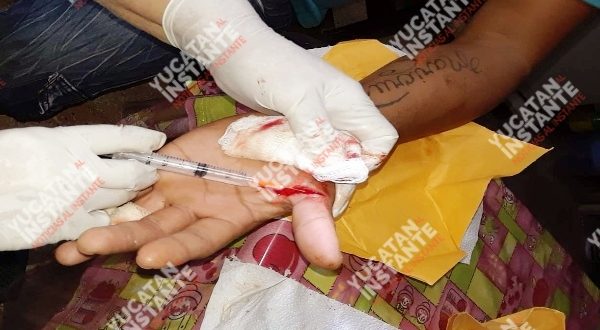Kinchil, Yuc., 11 de noviembre de 2019.- Hasta la borrachera se le bajó a Mario E.P.B., pues cuando cargaba sus misiles a bordo de su bicicleta se le cayó uno de estos, pero en su afán de salvarlo acabó cortando los dedos de la mano y brazo, al quebrar el envase. Qué originó que se llevara 15 puntadas.
