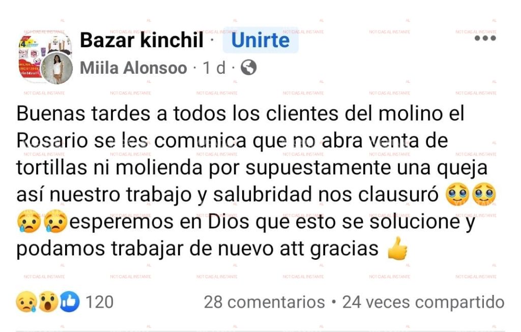 Ante este inesperado cierre la señora Mila Alonso, encargada de dicha tortillería emitió un breve comunicado en las redes sociales sobre esta clausura al informar a la clientela y amigos que por una “queja” hacia su trabajo les cerraron el negocio por salubridad, por lo que confía en que pronto se solucione para volver a vender.