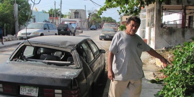 Chicxulub Puerto.— Anteanoche domingo, a las 9:30, ocurrió lo que tanto temían habitantes de esta comisaría: un poste de madera se quebró y cayó; el saldo fue de tres autos dañados en la calle 14 entre 21 y 23.