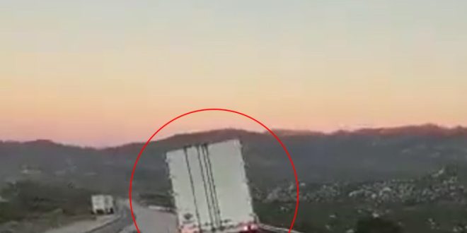 Un video en redes sociales muestra un camión de carga tirado en su costado izquierdo y apenas un segundo después, el hombre que graba con su celular enfoca a otro camión de carga justo en el momento en que empieza a ser desbalanceado por una potente ráfaga de viento.
