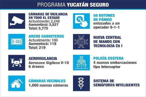Sobre las cámaras de seguridad, en el evento se detalló que Mérida pasará de contar con 1,598 a 2,828 unidades; Progreso, de 73 a 283; Izamal, de 12 a 212; Motul, de 24 a 109; Tizimín, de 48 a 188; Valladolid, de 56 a 231; Maxcanú, de 26 a 146; Ticul, de 14 a 94; Oxkutzcab, de 16 a 151; mientras que Muna y Tekax, que no contaban con unidades, dispondrán de 35 y 135, respectivamente.