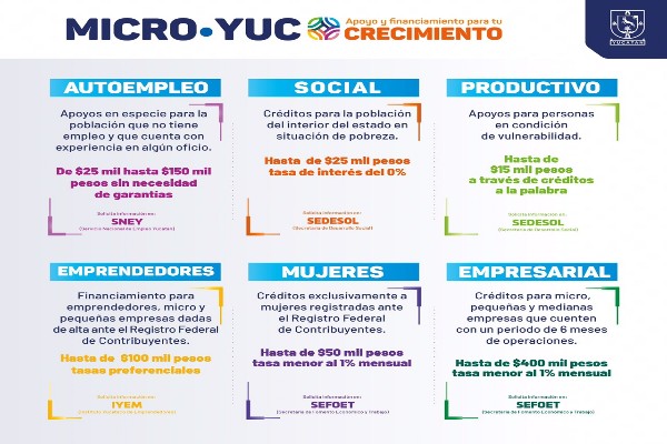 “MicroYuc Empresarial”: dirigido a micro, pequeñas y medianas empresas para fomentar el desarrollo de actividades industriales, comerciales y de servicios. Se podrá acceder a créditos hasta de 400 mil pesos y se busca detonar la vocación regional para impulsar el desarrollo de cada localidad. Los únicos requisitos son que las empresas ya cuenten con un periodo de 6 meses de operaciones, una garantía prendaria o hipotecaria equivalente al monto a solicitar superior a un aval solidario. El monto podrá ser devuelto en un periodo hasta de 48 meses, con una tasa de menos del 1% mensual.