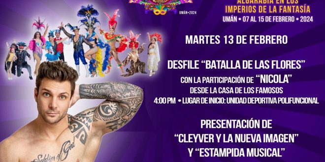 Martes 13 de Febrero “Desfile Batalla de Flores” en el que se contará con la participación de “Nicola Porcela” desde las Casa de los Famosos a partir de las 4:00 pm y al finalizar la presentación de “Cleyver y la Nueva Imagen” y “Estampida Musical”.