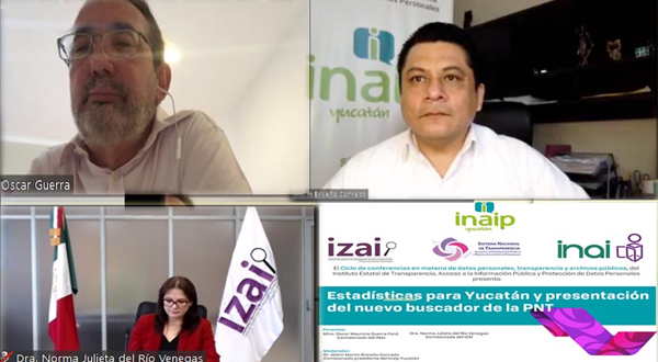 La ponencia Estadísticas de Yucatán y presentación del nuevo buscador de la PNT, fue moderada por el Comisionado Presidente, Aldrin Martín Briceño Conrado. La exposición corrió a cargo del Comisionado Oscar Mauricio Guerra Ford, Comisionado del Instituto Nacional de Transparencia, Acceso a la Información y Protección de Datos Personales (INAI), y la Dra. Norma Julieta del Río Venegas, Comisionada del Instituto Zacatecano de Transparencia, Acceso a la Información y Protección de Datos Personales, quien también coordina la Comisión de Tecnologías de Información y PNT del Sistema Nacional de Transparencia.