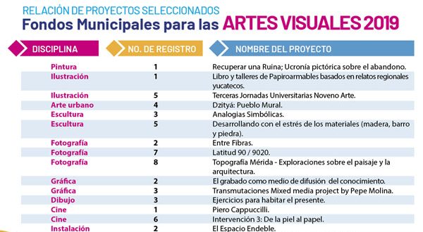 Variedad de propuestas que reafirman la vocación cultural de Mérida se refleja en los 18 proyectos seleccionados del Fondo Municipal para las Artes Visuales 2019. El mayor número de proyectos seleccionados fue en el área de Fotografía con 3, le siguió Escultura (2), Ilustración (2), Instalación (2), Gráfica (2) y Cine (2), mientras que de Pintura, Dibujo, Arte Urbano, Video Arte, Dibujo y Arte del Cuerpo se designó uno por disciplina.
