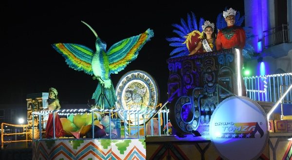 El primer carro alegórico que se presentó fue el de los Reyes Juveniles, Javelin Valeria Andonegui Osorio “Valeria I” y Manuel Barco Nah “Manuel I”, el cual lleva por nombre “El Grandioso Kukulkán” en honor a la deidad mitologica maya, la cual es semejante a una serpiente emplumada, dicho carro luce una figura de “Chacmol” en la parte superior, con una escalinata y al frente resaltan dos figuras mayas.