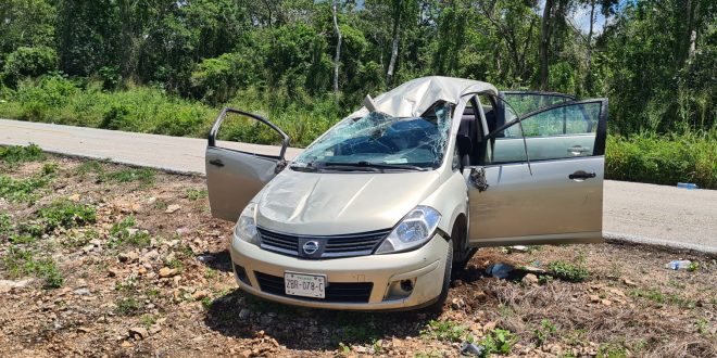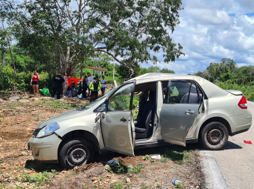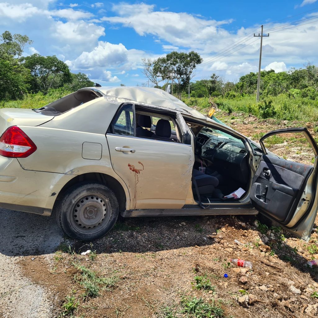 Según lo averiguado la tarde de este mipercoles, Leticia Noble Vega, de 29 años guiaba el Nissan Tiida con placas ZVR078C, el cual era prestado a sus familiares que viven en esta entidad. En eso estaba Leti, cuando de pronto se orilló apenas de la carretera, y dio el volantazo, provocando que diera varias volteretas hasta finalizar en posición normal con el auto dado en la torre. De igual forma iba acompañado de su pareja Cruz Israel García Velazquez, de 31 años, el cual iba como copiloto presento una herida tipo escalpe craneal, quedando en suspenso ai estado de salud. Mientras la conductora resultó policontundida, siendo llevados ambos al Hospital Juárez de la Ciudad de Mérida.