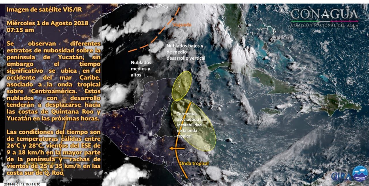 Para la tarde se pronostican de chubascos a tormentas puntuales fuertes en las porciones noroeste, centro, noreste y oriente del estado por el establecimiento de una vaguada y el ingreso de una nueva onda tropical a la región. Para Mérida también se pronostican lluvias esta tarde