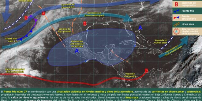 En las próximas 24 horas continuará el dominio de un sistema de alta presión sobre la Península de Yucatán; sin embargo, el ingreso de aire marítimo tropical, en combinación con el calentamiento diurno, favorecerá la presencia de nubosidad y precipitaciones aisladas. Se esperan chubascos aislados en el sur y centro de Quintana Roo, así como lloviznas aisladas en el oriente de Yucatán, mientras que en el resto de la región no se prevén lluvias.
