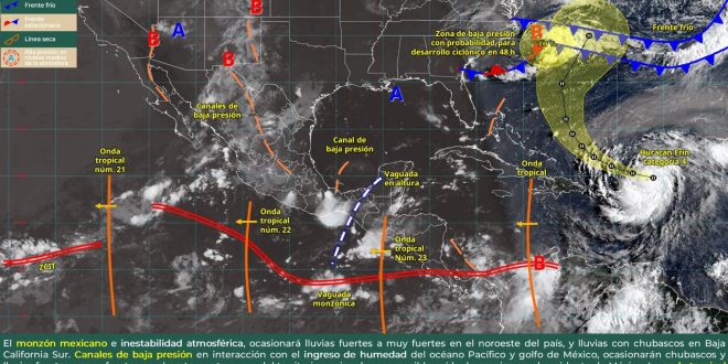 De acuerdo con el reporte meteorológico, la influencia de la onda tropical número 23 y la divergencia en niveles superiores favorecerán lluvias puntuales fuertes en el oriente y sur de Yucatán, así como en el centro y sur de Campeche. En Quintana Roo se prevén chubascos dispersos en el centro y norte.