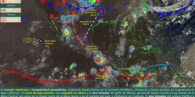 De acuerdo con el pronóstico, una vaguada en altura, en interacción con otra ubicada sobre la región, favorecerá el desarrollo de sistemas de tormenta, reforzados por el calentamiento diurno y la divergencia en niveles altos de la atmósfera.
