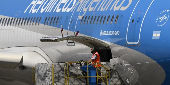 El avión que carga ocho toneladas de la vacuna, la primera contra la COVID-19 que se aplicará en Argentina, aterrizó alrededor de las 10:30 horas locales en el aeropuerto internacional de Ezeiza, en las afueras de la capital.