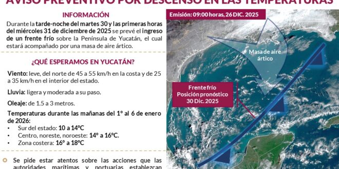 Mérida, Yucatán, a 26 de diciembre de 2025.- La Coordinación Estatal de Protección Civil (Procivy) informa que durante la tarde-noche del martes 30 y las primeras horas del miércoles 31 de diciembre se prevé el ingreso de un nuevo frente frío sobre la Península de Yucatán.