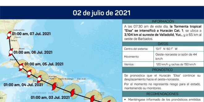 Conforme a registros del Servicio Meteorológico de la Comisión Nacional del Agua (Conagua), esta mañana, Elsa evolucionó a huracán categoría 1, ubicado a 65 kilómetros al oeste de Barbados y tres mil 104 al este de Valladolid, Yucatán, con vientos de 120 kilómetros por hora y rachas de 150.
