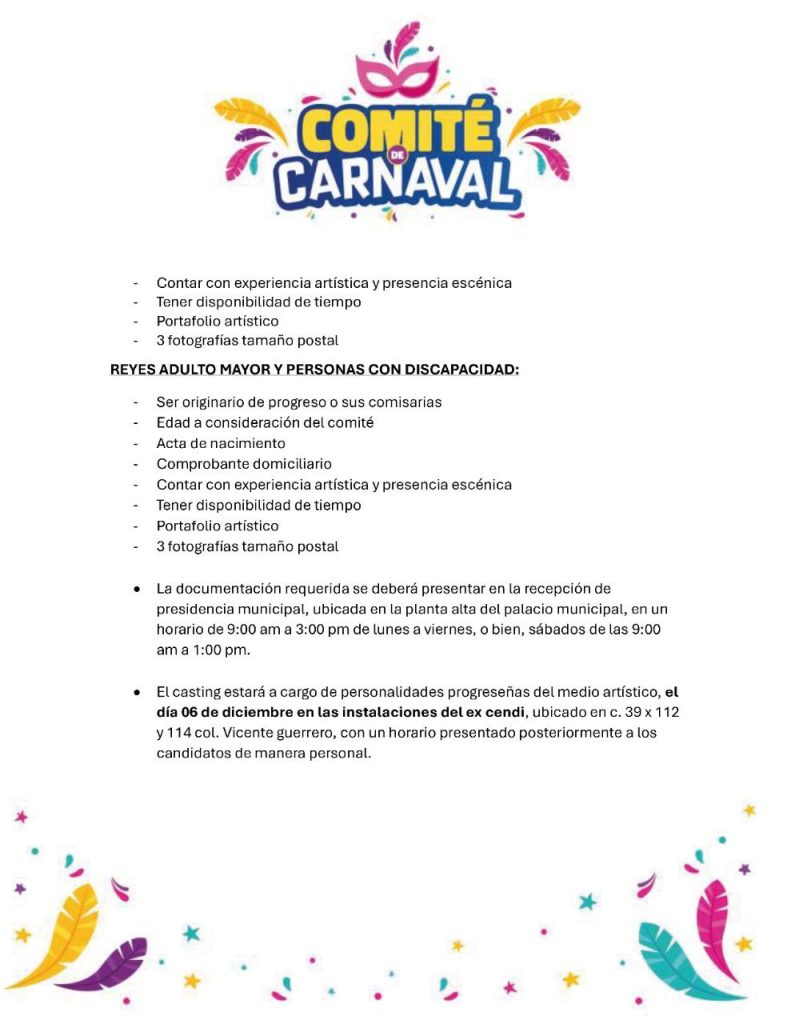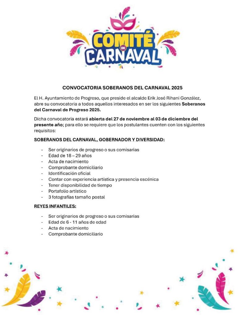Progreso, Yucatán, 27 de noviembre de 2024.- El Ayuntamiento de Progreso, presidido por el alcalde Ing. Erik José Rihani González, a través del Comité Organizador del Carnaval de Progreso 2024-2027, lanza la convocatoria dirigida a quienes deseen convertirse en los próximos soberanos del “Carnaval de Progreso 2025”.