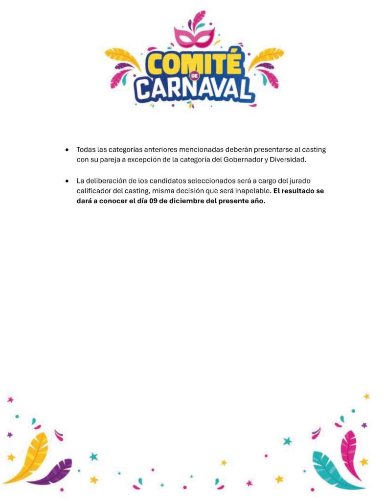 -La convocatoria estará disponible del 27 de noviembre al 3 de diciembre donde los interesados podrán presentar su solicitud para participar en las fiestas carnestolendas y representar al puerto en este evento lleno de diversión y música