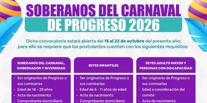 Progreso, Yucatán, 15 de octubre de 2025. — El Ayuntamiento de Progreso, encabezado por el alcalde Erik Rihani González, a través del Comité Organizador del Carnaval de Progreso 2025-2026, lanzó la convocatoria oficial para elegir a los próximos representantes del Carnaval de Progreso 2026.
