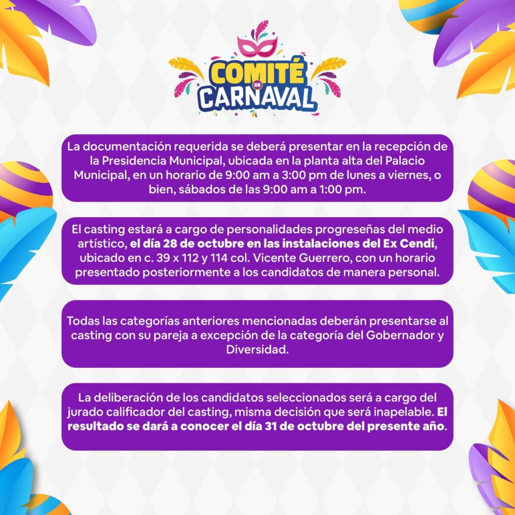 La presidenta del Comité, Áurea Elena Gómez Novelo, directora de Turismo, informó que la convocatoria estará abierta del 15 al 22 de octubre del presente año. El casting para elegir a los Soberanos del Carnaval —en las categorías Gobernador, Diversidad, Reyes Infantiles, Reyes del Adulto Mayor y Personas con Discapacidad— se realizará el martes 28 de octubre, en las instalaciones del ex CENDI.