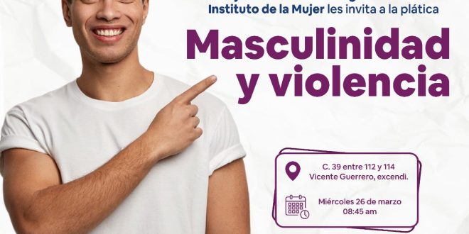 Progreso, Yucatán, a 22 de marzo de 2025. Con el objetivo de fomentar la reflexión y el diálogo sobre nuevas perspectivas de la masculinidad, el Instituto Municipal de la Mujer (IMM) de Progreso invita a la ciudadanía a participar en la plática “Masculinidad y violencia”, que se llevará a cabo el miércoles 26 de marzo a las 8:45 de la mañana en las instalaciones del ex CENDI, ubicado en la calle 39 entre 112 y 114, colonia Vicente Guerrero.