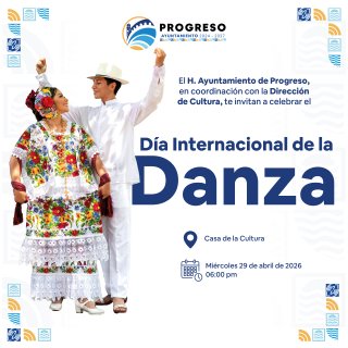 Progreso, Yucatán, 10 de abril de 2026.– El H. Ayuntamiento de Progreso, encabezado por el alcalde Erik Rihani González, en coordinación con la Dirección de Cultura, a cargo de Cruz David Chan Martínez, invita a las familias del municipio y a visitantes a conmemorar el Día Internacional de la Danza este miércoles 29 de abril a las 18:00 horas en la Casa de la Cultura.