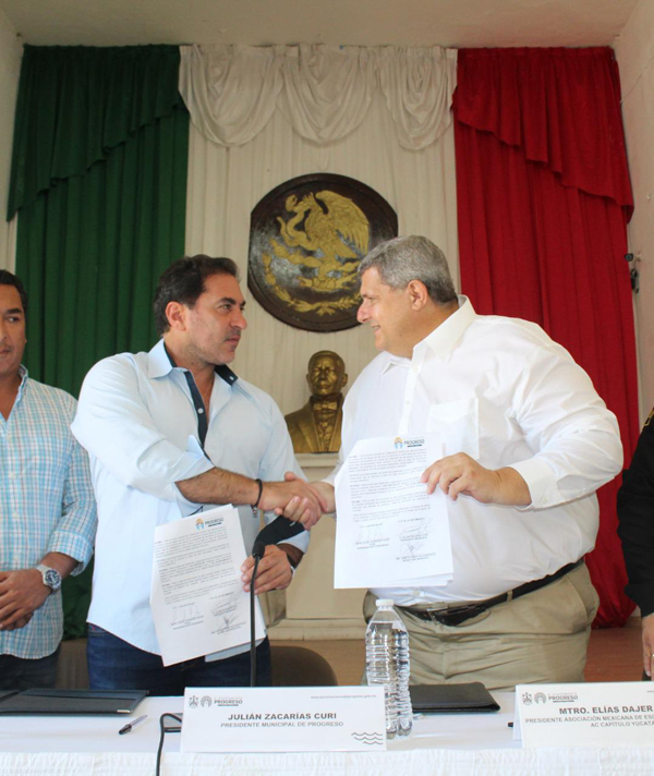 Progreso, Yucatán. El alcalde Julián Zacarías Curi y el Presidente de la Asociación Mexicana de Escuelas Particulares A.C., Capitulo Yucatán, el maestro Elías Dájer Fadel, firmaron un convenio para que hijos de policías municipales cuenten con becas del cien por ciento en cualquiera de las siete escuelas privadas de Progreso.