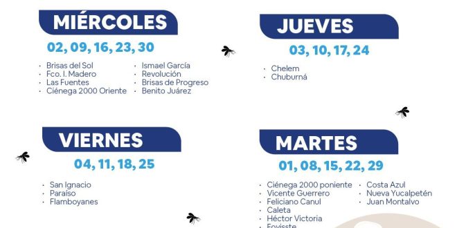 -Martes 1, 8, 15, 22 y 29: Colonias Ciénega 2000 Poniente, Vicente Guerrero, Feliciano Canul, Héctor Victoria, Fovissste, Centro, Costa Azul, Nueva Yucalpetén, Juan Montalvo y la zona de la Caleta.