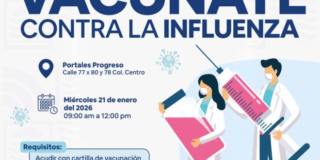 Progreso, Yucatán, a 20 de enero de 2026.– La Dirección de Salud, en coordinación con el CESSA Progreso, invita a la población a participar en la campaña preventiva “Vacúnate contra la influenza”, iniciativa que se impulsa durante la temporada invernal con el objetivo de prevenir enfermedades respiratorias y cuidar la salud de todas y todos.
