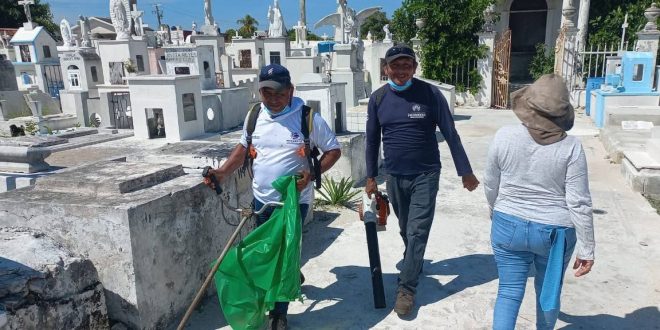 Progreso, Yucatán, 21 de octubre de 2025.-Con el compromiso de mantener espacios públicos dignos y en buen estado para todas las familias progreseñas, el Ayuntamiento de Progreso realiza labores de limpieza y mantenimiento en los cementerios del municipio y de las comisarías de Chicxulub, Chelem y Chuburná.