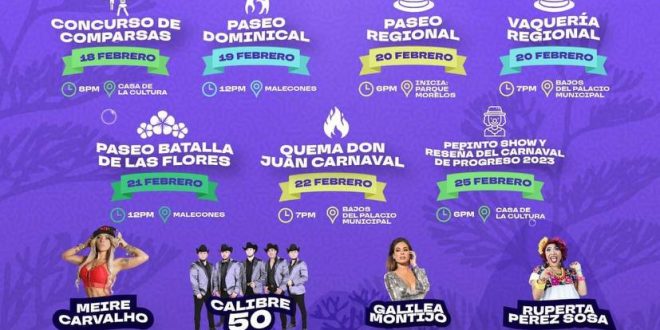 El Comité del Carnaval de Progreso 2023 invita a la ciudadanía a disfrutar de los eventos programados de esta semana, de los que destacan los paseos Infantil, de Fantasía y el Dominical, en este último se contará con la presencia de la conductora de televisión Galilea Montijo, y la presentación del grupo norteño banda Calibre 50 así como de la DJ Marie Carvalho